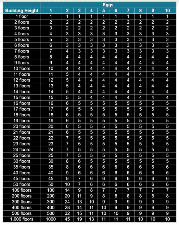 假如鸡蛋没有碎, 则蛋数不变, 楼层数退化为 , 仍需要的次数: