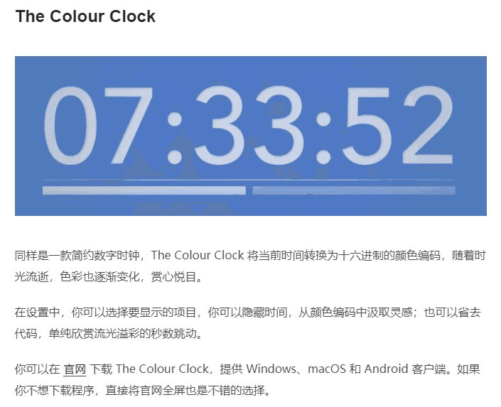 - 时间和颜色的文字大小相同会对注意力中心造成干扰, 微调了两者的大小. 同时调整了一些样式, 使字体在不同颜色的背景上都醒目一些. 颜色值前加上了 #, 避免歧义 最终效果如下: