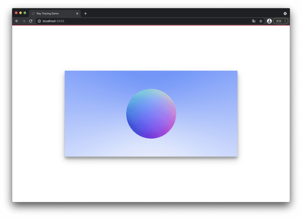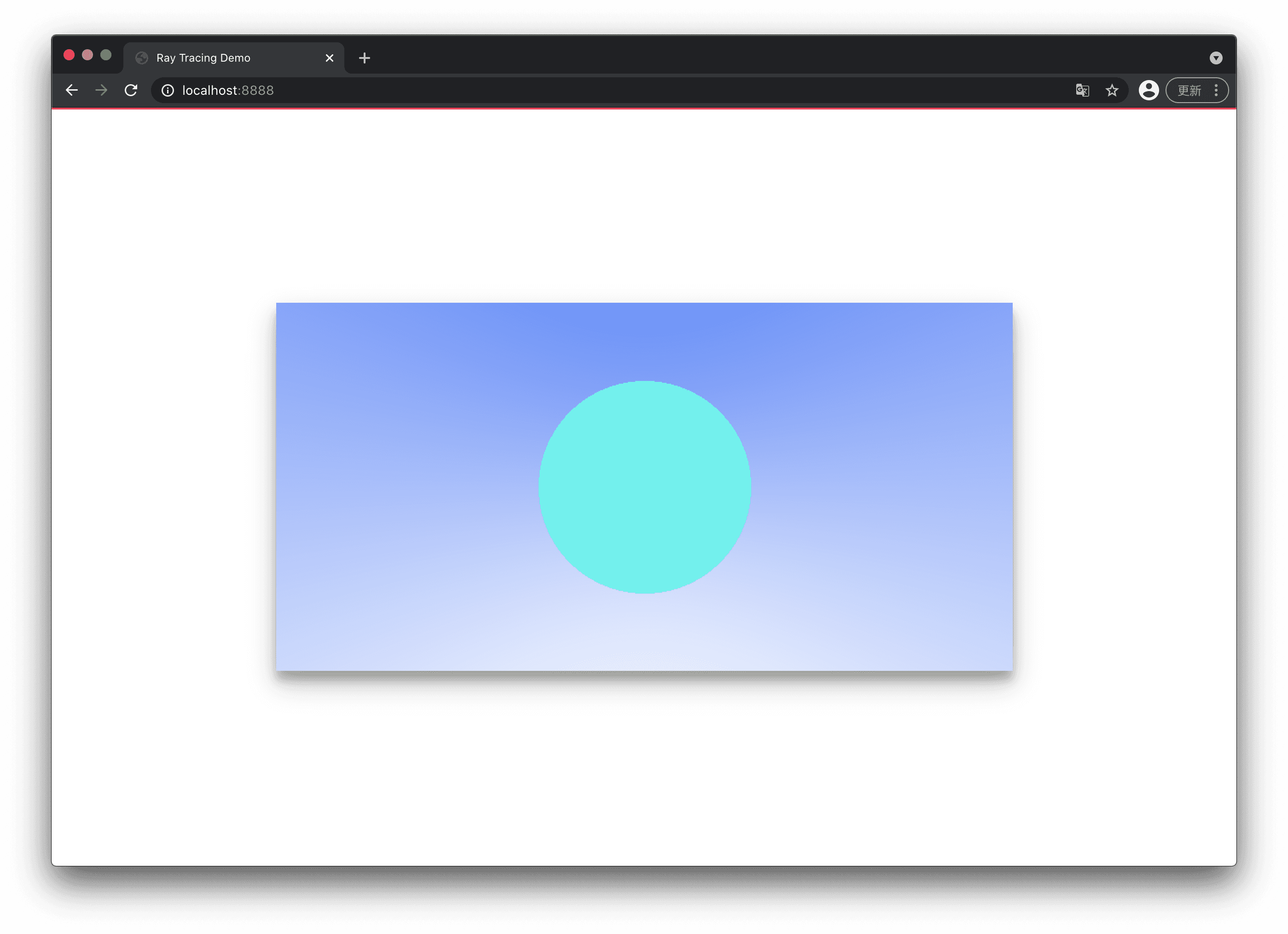 const camera = new Camera(new Vec3(0, 0, 0), //originnew Vec3(-2, -1, -1), //leftBottomnew Vec3(4, 0, 0), //horizontalnew Vec3(0, 2, 0) //vertical);const ball = new Sphere(new Vec3(0, 0, -1), 0.5)export default (x: number, y: number) => {const r = camera.getRay(x, y);const hit = ball.hit(r, 0, Infinity);let res: Vec3;if (hit) {res = new Vec3(37 / 255, 244 / 255, 238 / 255);} else {const unitDirection = r.direction.unitVec();const t = (unitDirection.e1 + 1) / 2;res = Vec3.add(new Vec3(1, 1, 1).mul(1 - t),new Vec3(0.3, 0.5, 1).mul(t));}return res.toArray();}