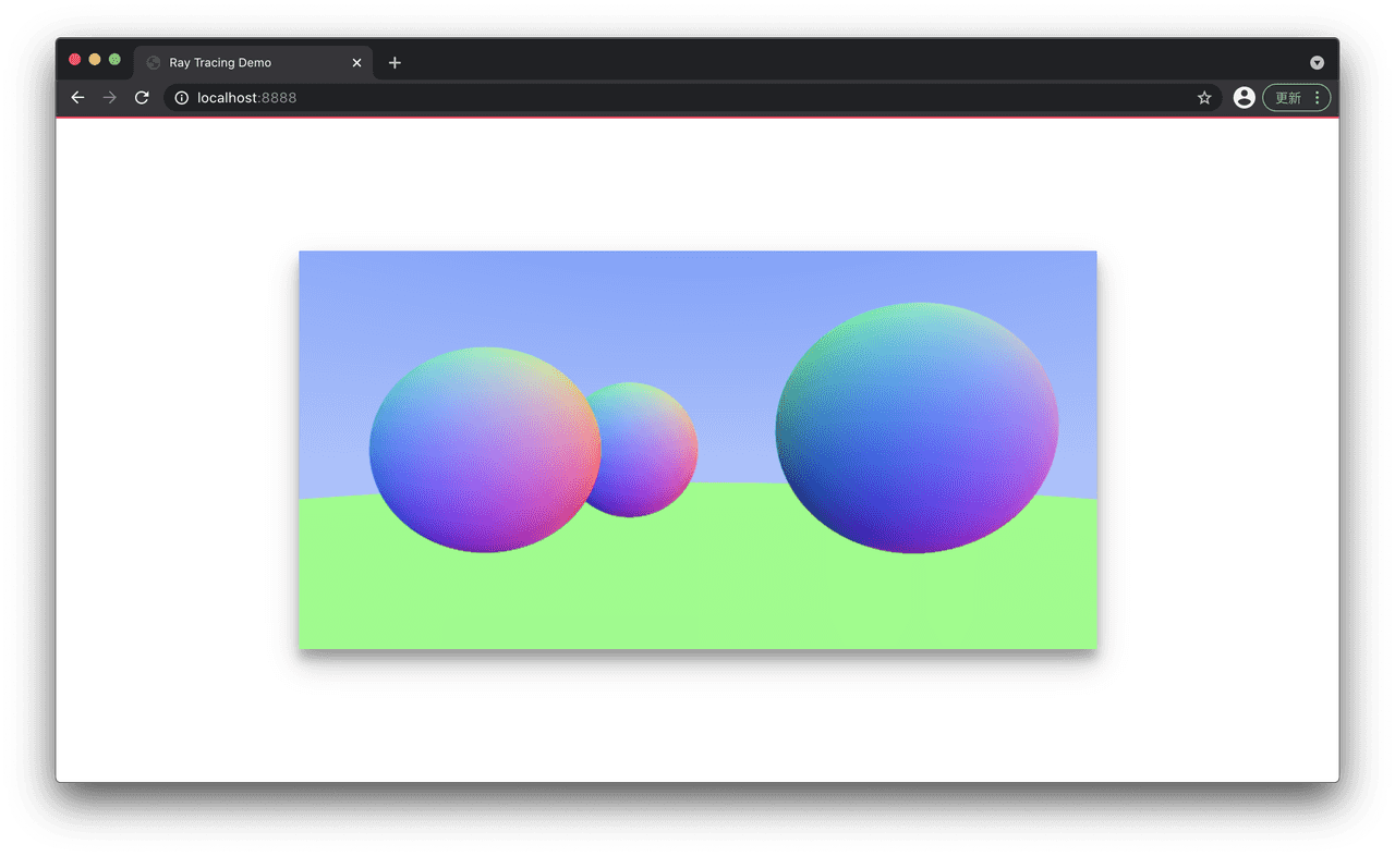 const camera = new Camera(new Vec3(0, 0, 1), // originnew Vec3(-2, -1, -1), // leftBottomnew Vec3(4, 0, 0), // horizontalnew Vec3(0, 2, 0) // vertical);const world = new HitList([new Sphere(new Vec3(-0.5, 0, -2), 0.5),new Sphere(new Vec3(1, 0.1, -1), 0.6),new Sphere(new Vec3(-1, 0, -1), 0.5),new Sphere(new Vec3(0, -100.5, -1), 100), // world]);const hit = world.hit(r, 0, Infinity);