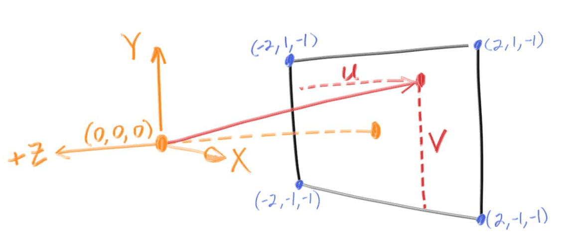 const camera = new Camera(new Vec3(0, 0, 0), //originnew Vec3(-2, -1, -1), //leftBottomnew Vec3(4, 0, 0), //horizontal: Vec3(2, -1, -1) - Vec3(-2, -2, -1)new Vec3(0, 2, 0) //vertical: Vec3(-2, 1, -2) - Vec3(-2, -1, -2));