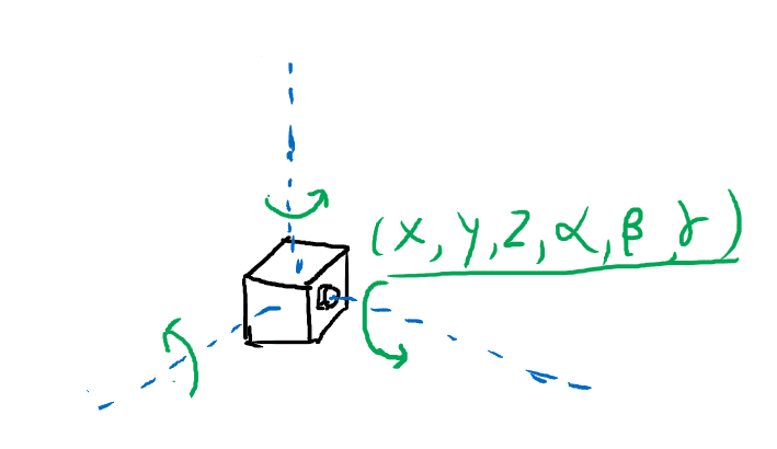 下一步是相机的方向. 我们已经有了相机的位置, 因为三维空间的自由度是 6, 因此要完全确定相机的姿态, 还需要另外三个角度数值, 如下图所示