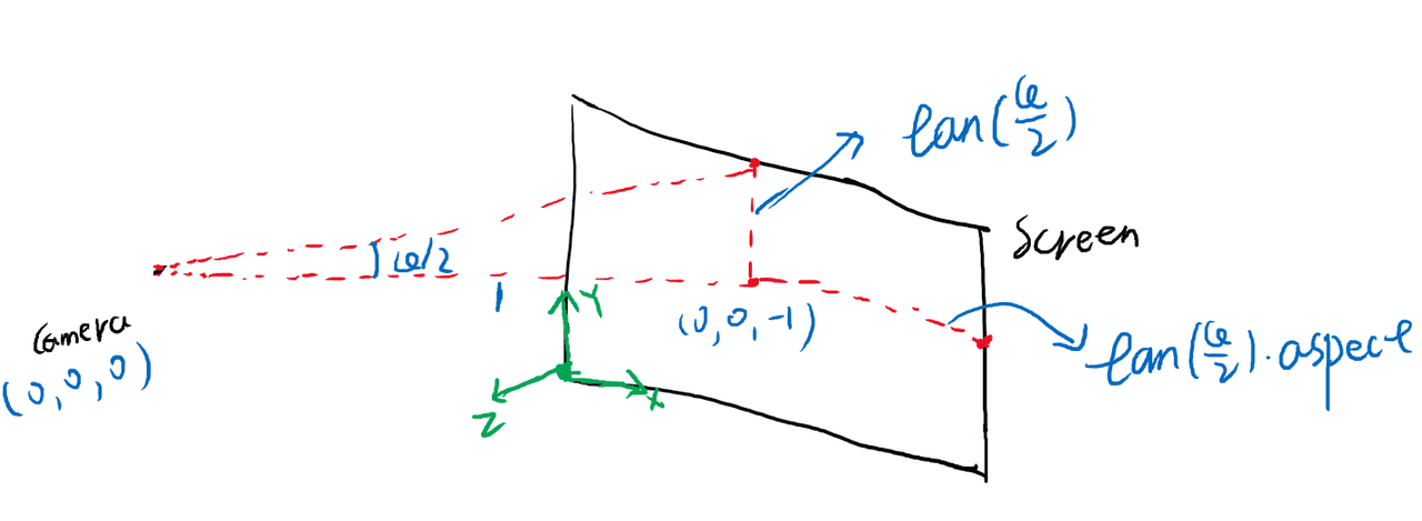 constructor(origin: Vec3, vfov: number, aspect = 2) {const θ = (vfov * Math.PI) / 180;const harfHeight = Math.tan(θ / 2);const harfWidth = harfHeight * aspect;this.origin = origin;this.leftBottom = new Vec3(-harfWidth, -harfHeight, -1).add(origin);this.vertical = new Vec3(0, harfHeight * 2, 0);this.horizontal = new Vec3(harfWidth * 2, 0, 0);}