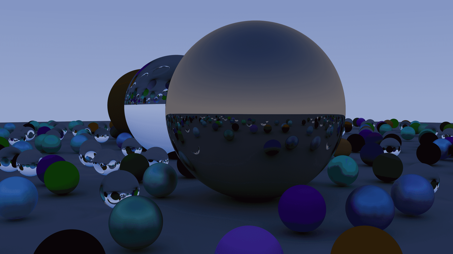 function createSence(): Hitable {const list: Hitable[] = new Array(20).fill(0).map((v, _a) =>new Array(20).fill(0).map((v, _b) => {const a = _a - 11;const b = _b - 11;const choose_mat = random(a * 310 + b);const center = new Vec3(a + 0.9 * random(a * 311 + b), 0.2, b + 0.9 * random(a * 312 + b));if (center.sub(new Vec3(4, 0.2, 0)).length() > 0.9) {if (choose_mat < 0.4) {return new Sphere(center,0.2,new Lambertian(new Vec3(random(a * 313 + b) * random(a * 314 + b),random(a * 315 + b) * random(a * 316 + b),random(a * 317 + b) * random(a * 318 + b))));} else if (choose_mat < 0.7) {return new Sphere(center,0.2,new Metal(new Vec3(0.5 * random(a * 319 + b), 0.5 * (1 + random(a * 320 + b)), 0.5 * (1 + random(a * 321 + b))),0.5 * (1 + random(a * 322 + b))));} else {return new Sphere(center, 0.2, new Dielectric(new Vec3(1, 1, 1), 1.5));}}})).reduce((a, b) => a.concat(b)).filter(i => i);list.push(new Sphere(new Vec3(4, 1, 0), 1, new Metal(new Vec3(0.7, 0.6, 0.5), 0)));list.push(new Sphere(new Vec3(-4, 1, 0), 1, new Lambertian(new Vec3(0.4, 0.2, 0.1))));list.push(new Sphere(new Vec3(0, 1, 0), 1, new Dielectric(new Vec3(1, 1, 1), 1.5)));list.push(new Sphere(new Vec3(0, -1000, 0), 1000, new Lambertian(new Vec3(0.5, 0.5, 0.5))));return new HitList(list);}const world = createSence();